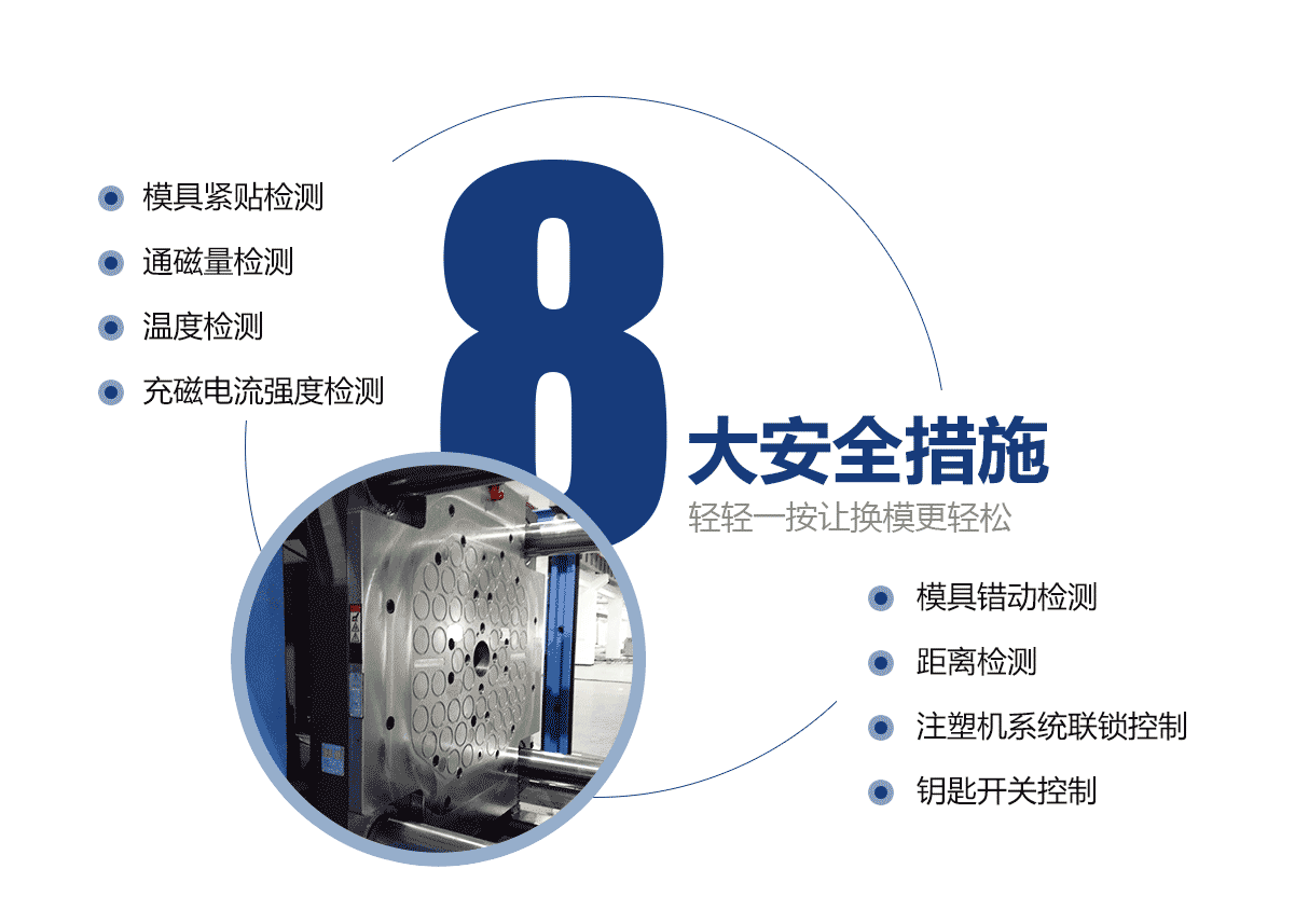 電永磁磁力模板大大提高注塑機換模效率。 自動化注塑機的換模方法僅需3分鐘即可完成。特大型注塑機模板的換模時間從超過2小時減少到10分鐘。